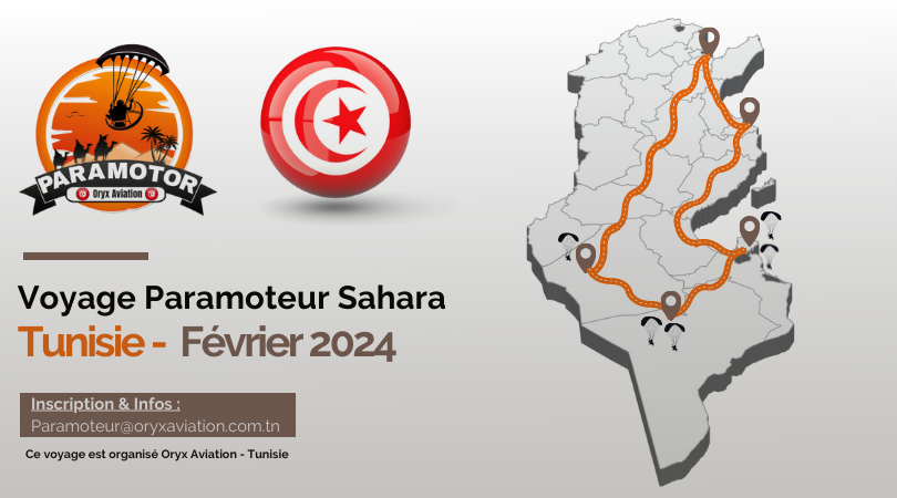 Découvrez l’aventure ultime du paramoteur dans le magnifique sud tunisien ! Rejoignez-nous pour une expérience inoubliable du 28 Novembre au 07 Decembre 2026. Notre circuit vous emmènera à travers les paysages époustouflants de Tozeur, Douz, et Djerba. Avec un maximum de 15 participants, réservez dès maintenant votre place pour une aventure unique dans les cieux tunisiens. Préparez-vous à vivre des moments de pur émerveillement et de découverte.